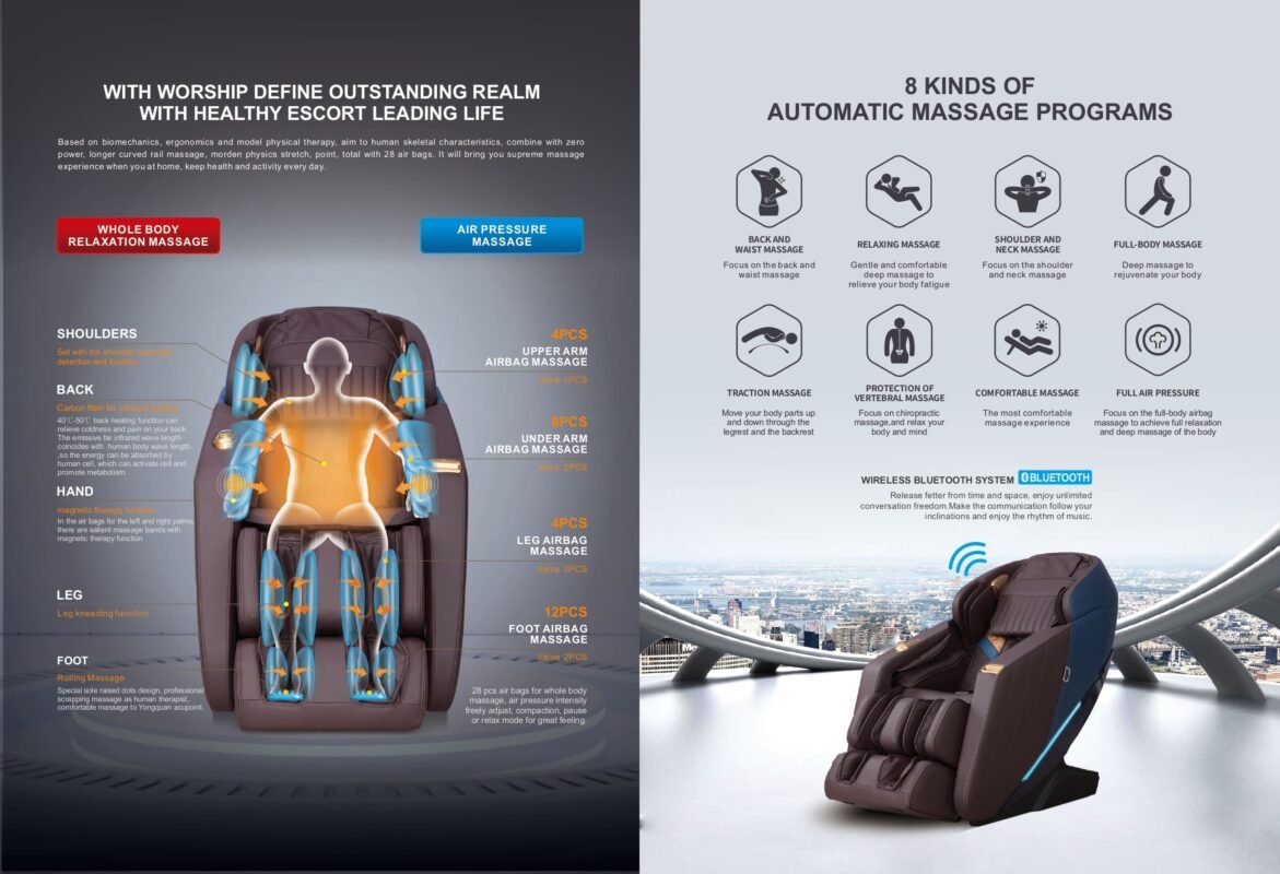Wireless Bluetooth System:Ā Break free from time and space constraints with the wireless Bluetooth system integrated into our massage chair. Connect your devices seamlessly and enjoy unlimited conversation freedom or listen to your favorite music, allowing you to create a personalized and immersive massage experience.