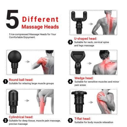 FeaturesSpherical head: suitable for massaging big muscle groups such as arms, back, lower back, thighs, and calves.Cylindrical head: suitable for impacting deep tissues such as meridians, palms, and soles.U-shaped head: suitable for massaging the neck, spine, and Achilles tendon.Flat head: suitable for relaxation and shaping of various muscle parts.Ā