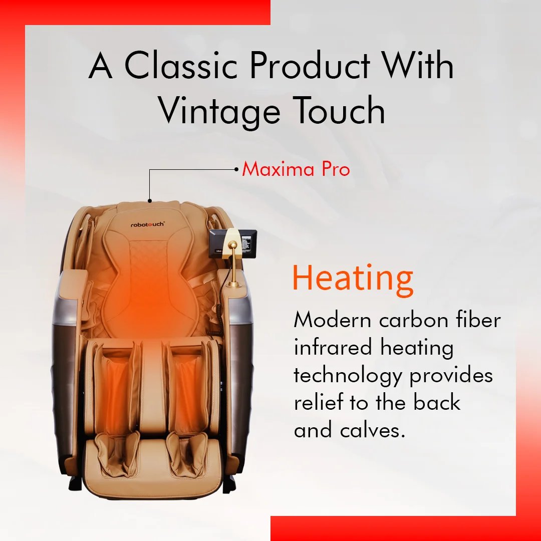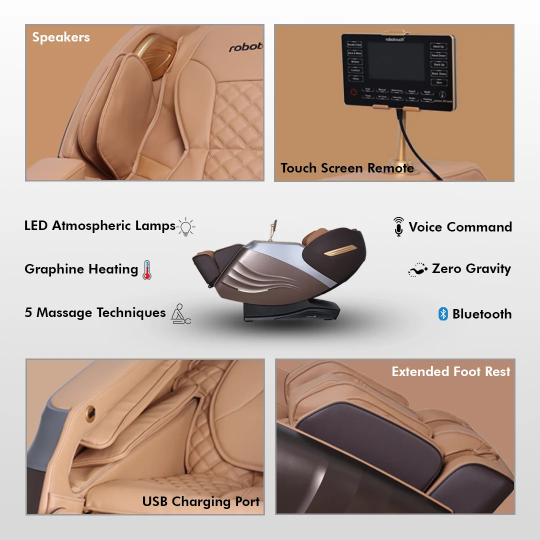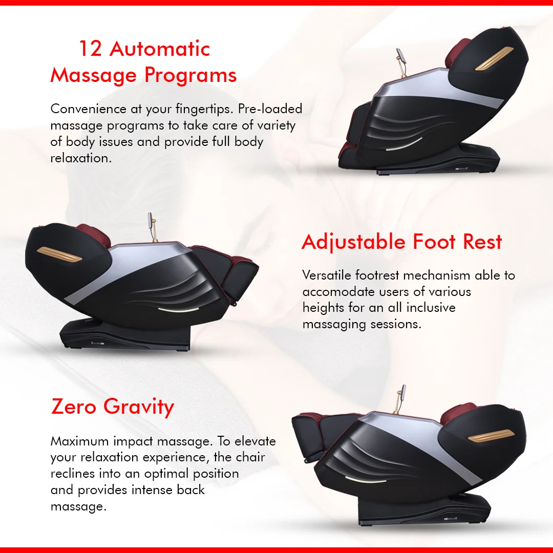RoboTouch Maxima Pro massage chair is loaded with highly customizable programs suited for every need. Interactive visual user interface synced with audio commands. High-quality roller mechanisms with premium leather to provide a transcendent massaging experience.