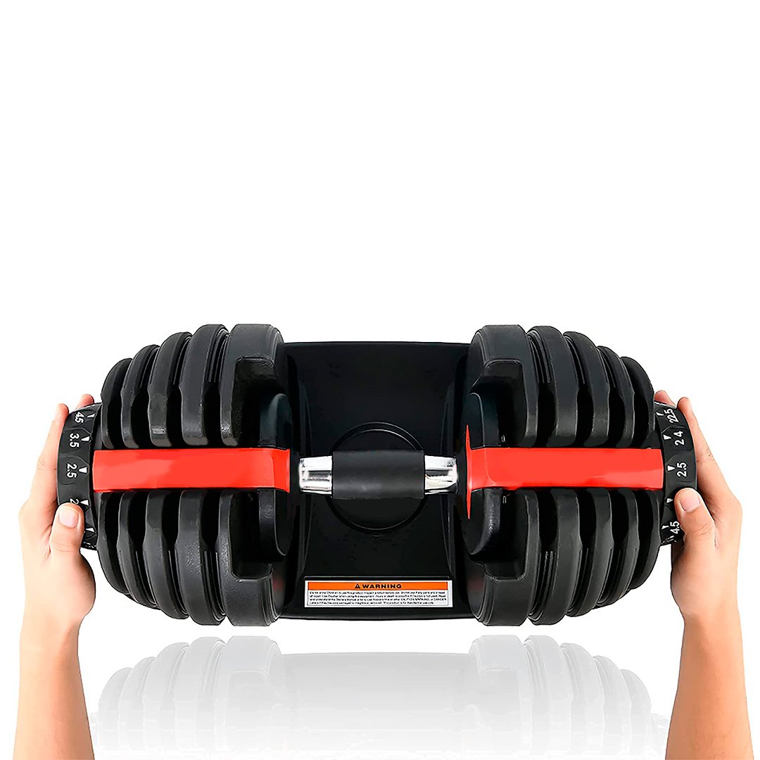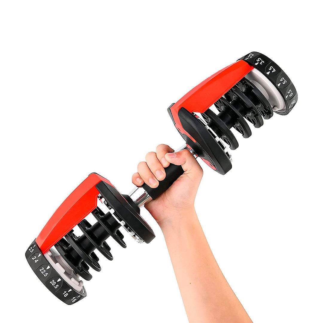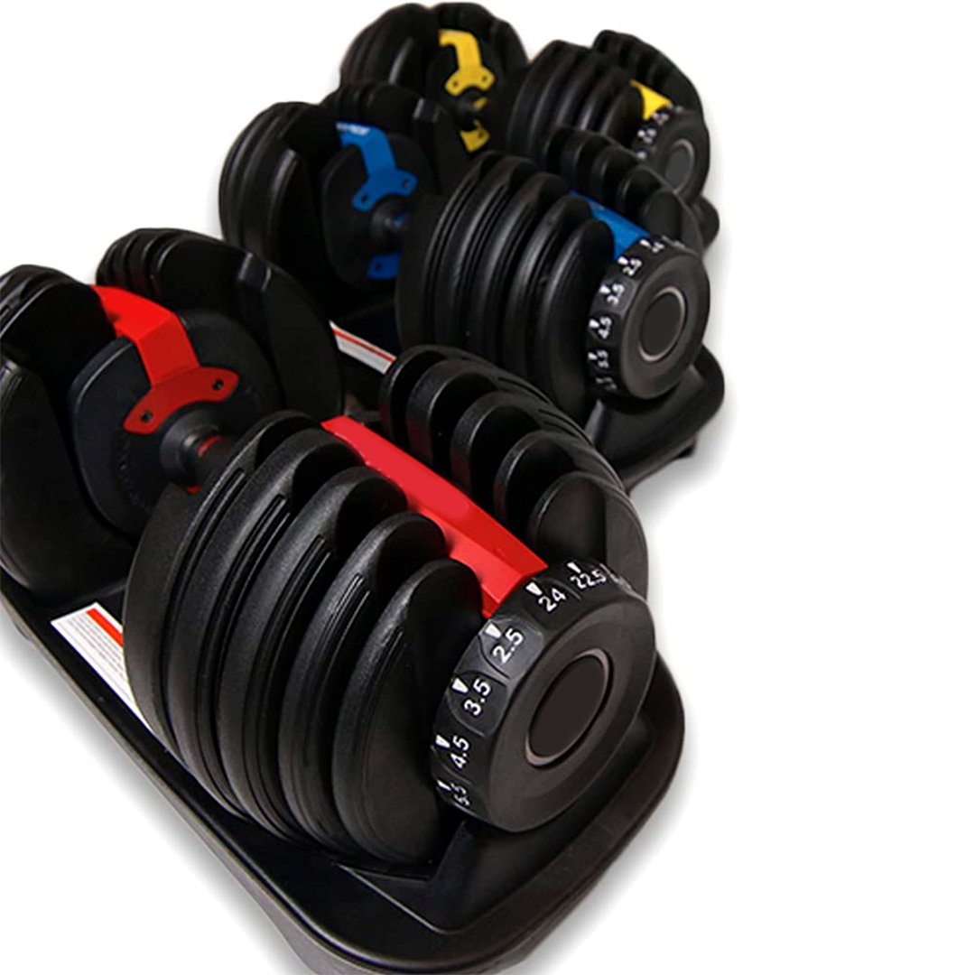 TheĀ Adjustable DumbbellĀ is the latest innovation in Home Fitness, replacing multiple sets of weights. 1Ā Adjustable DumbbellĀ is equivalent to 15 different dumbbells. The product has easy-to-use selection dials for adjusting weights. The weights adjust from 2.5 to 24 Kgs in 1-1.5 Kg increments.Ā
