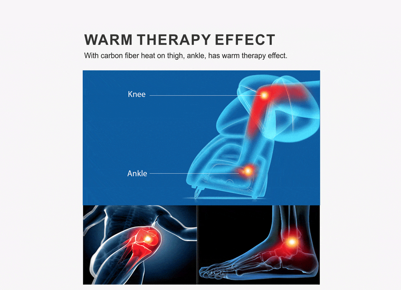 - Auto carbon-fiber generated heat on thigh and ankle areas for warm therapeutic effect